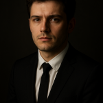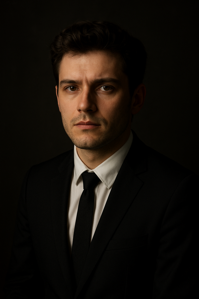 a hyper-realistic portrait of a young man in a classic photography studio, wearing a black suit and white shirt with a black tie, dramatic Rembrandt lighting, dark neutral background, cinematic composition, 85mm lens look, soft shadows, detailed skin texture, shallow depth of field, professional studio portrait photography style, realistic lighting, moody tone –ar 3:4 –v 6.0 –style raw